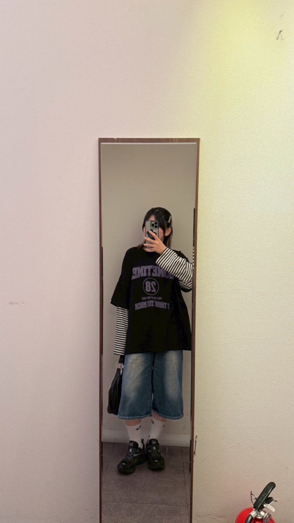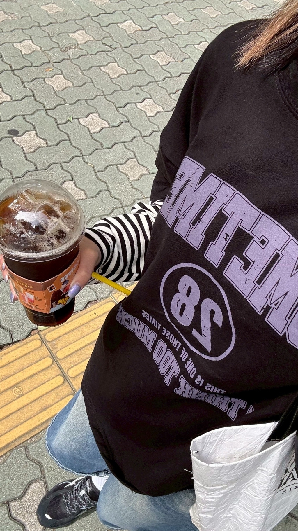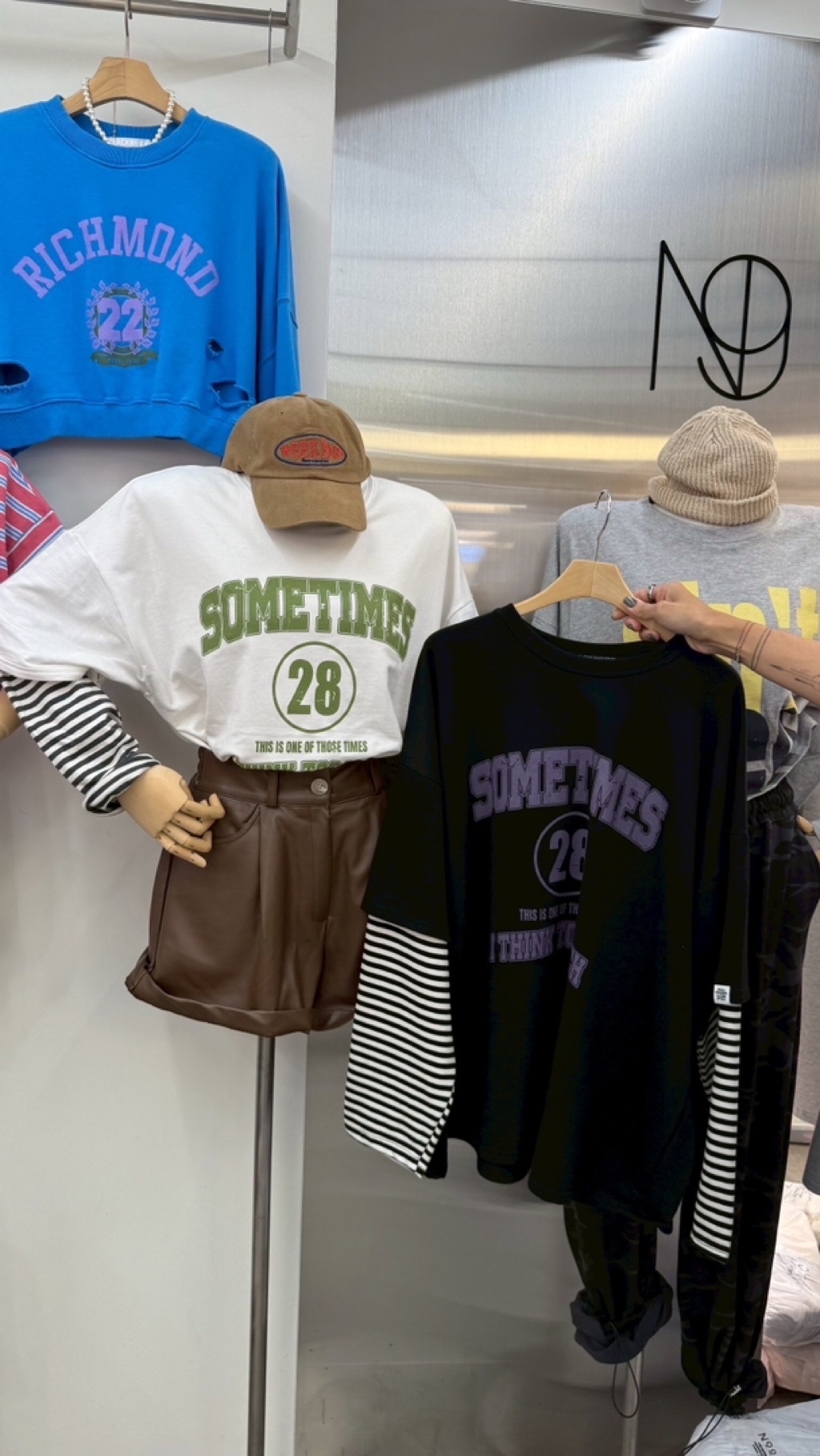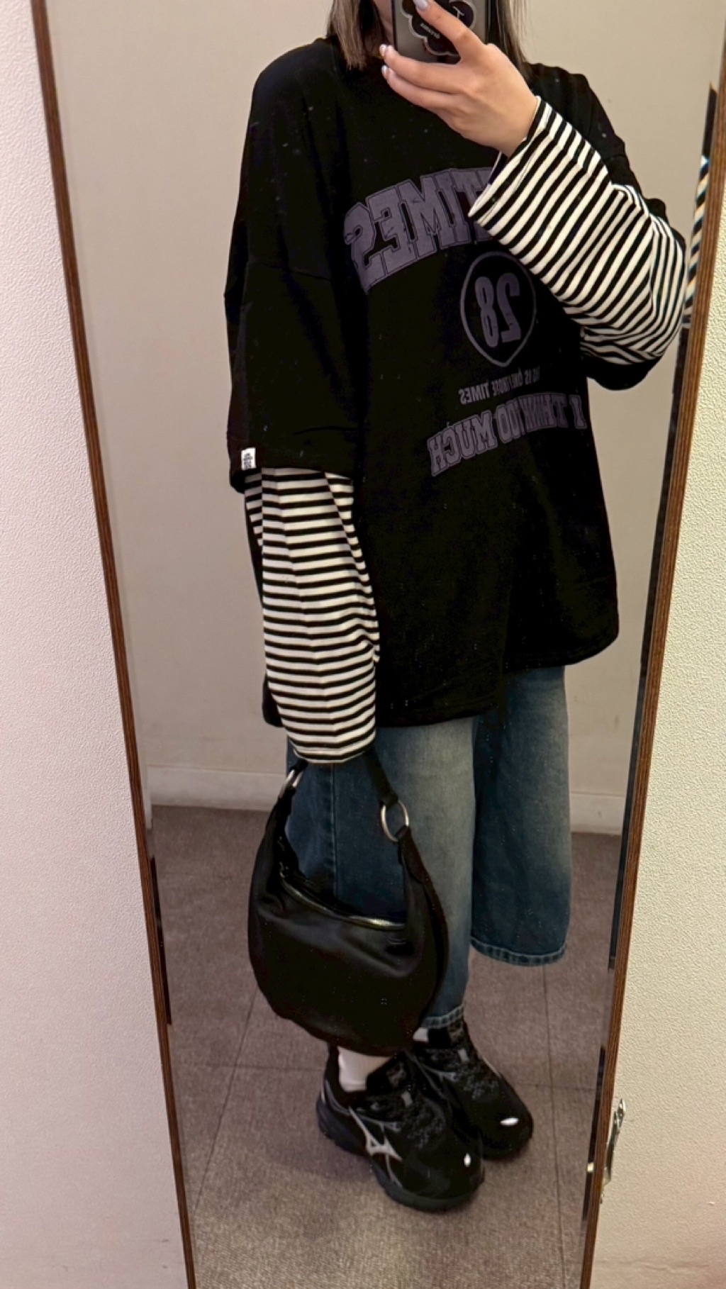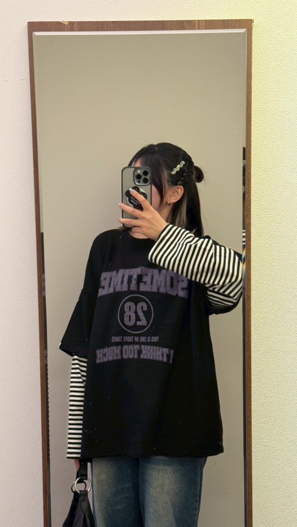 英字假兩件拼條紋袖美式大學tee