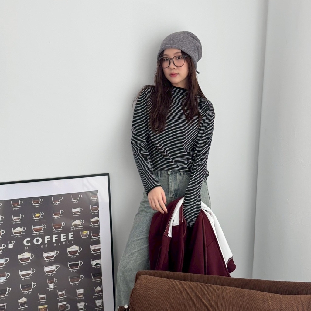 日系小立領條紋針織打底長袖上衣