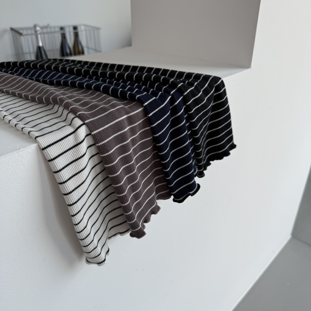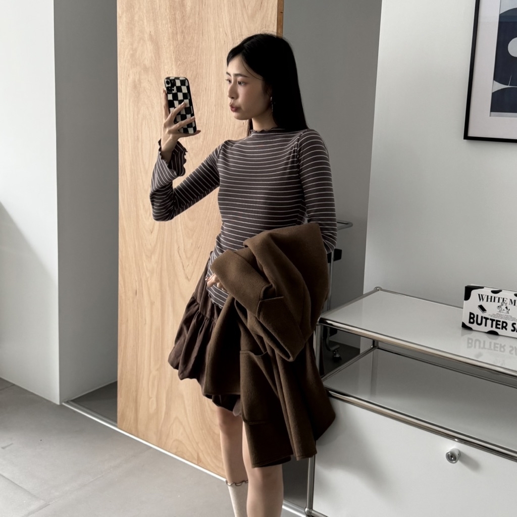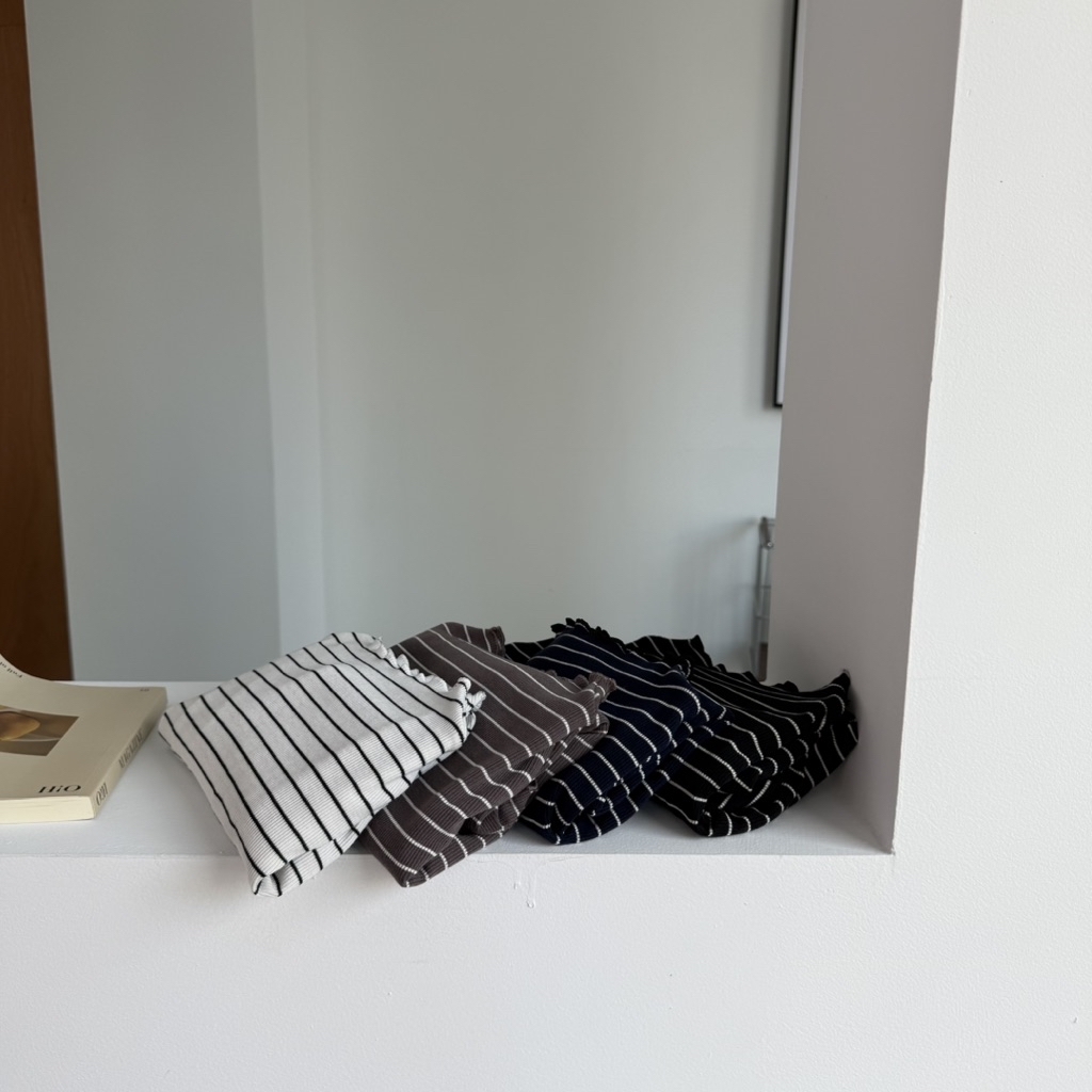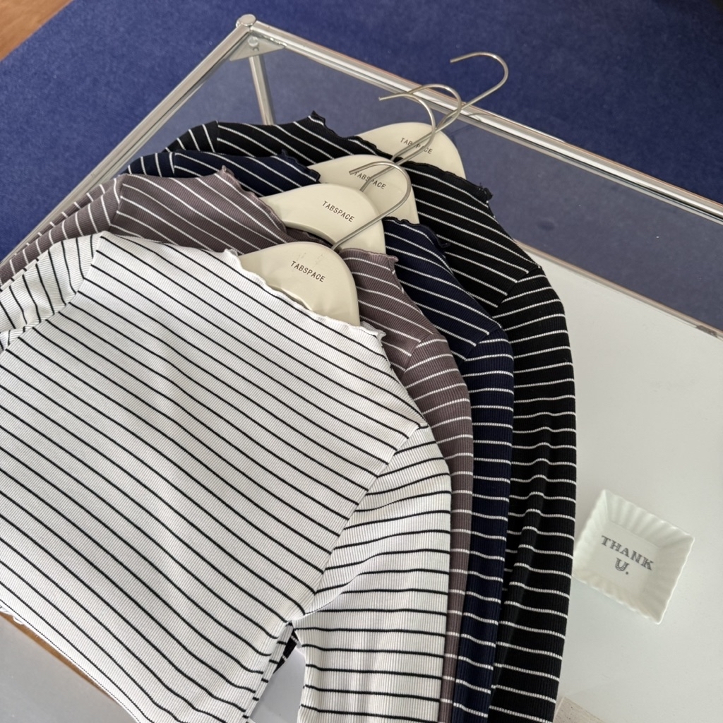 撞色條紋木耳邊打底微喇叭長袖上衣