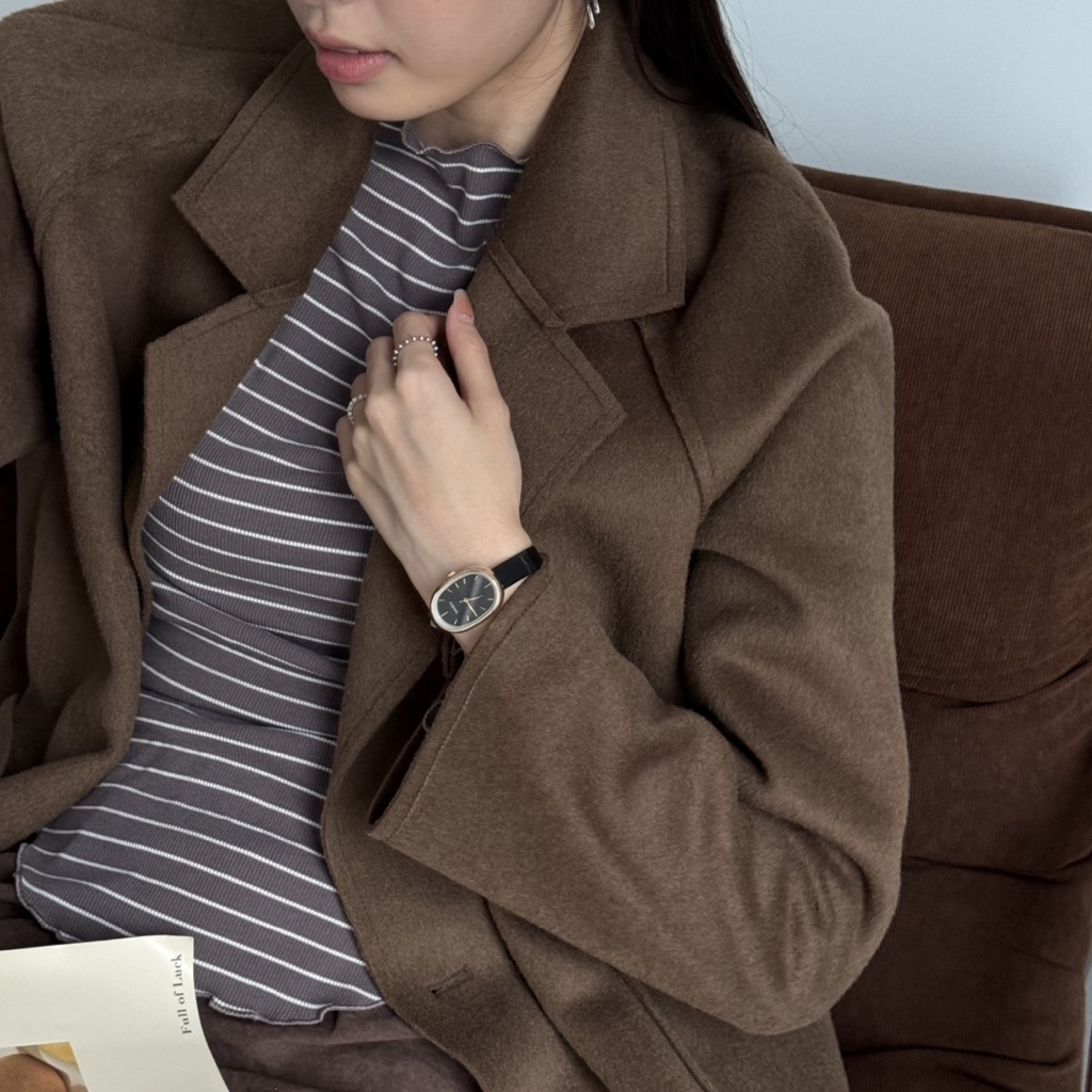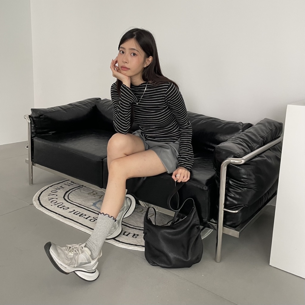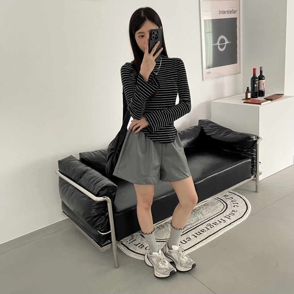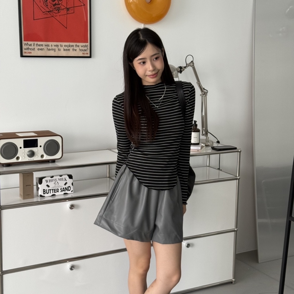 撞色條紋木耳邊打底微喇叭長袖上衣