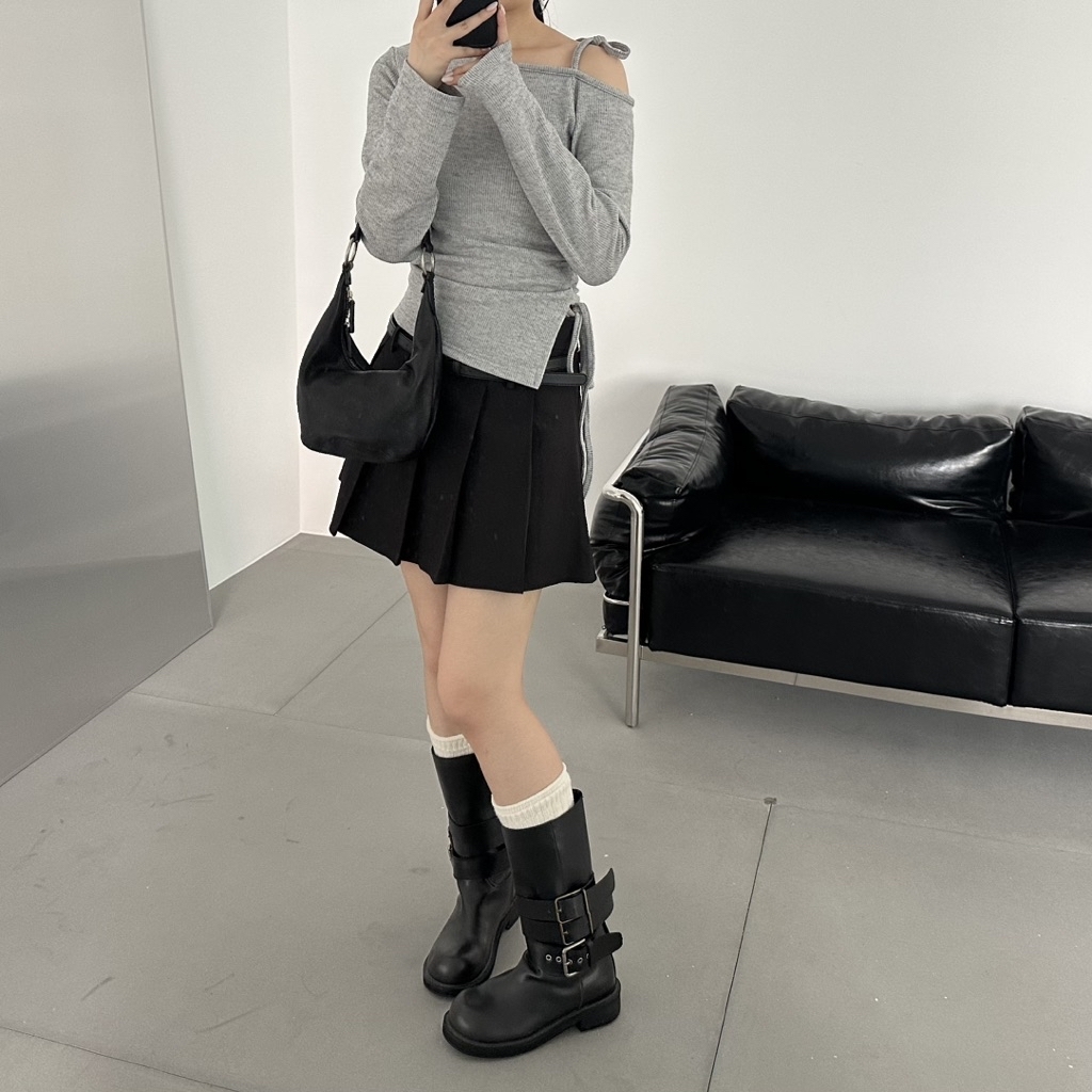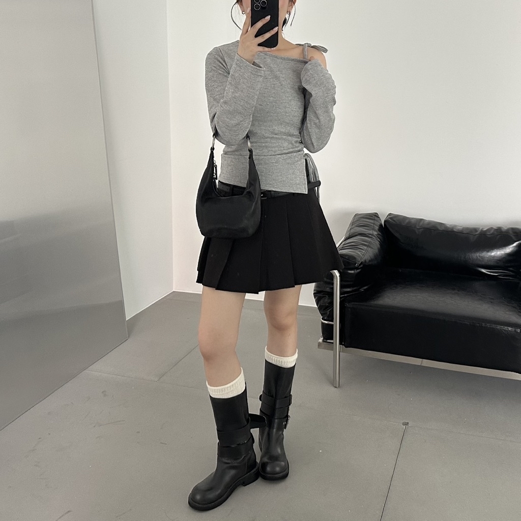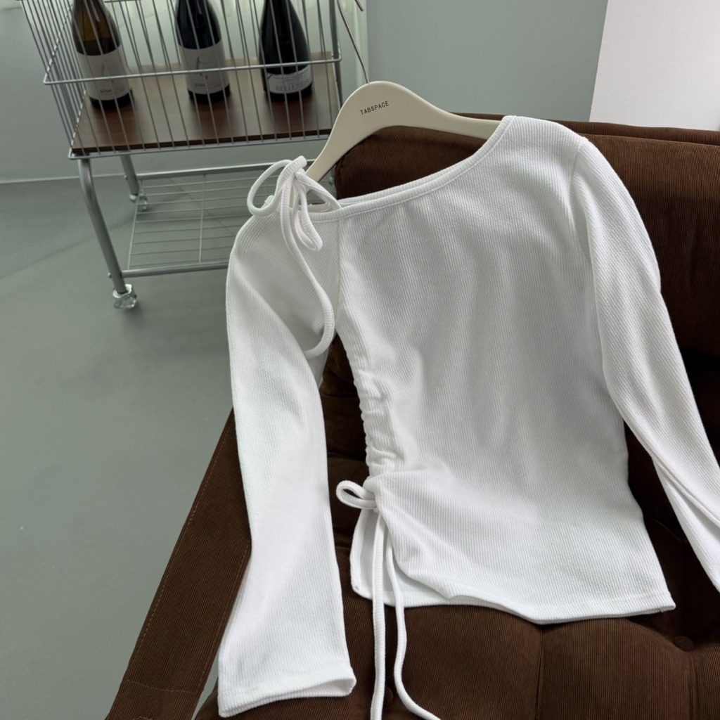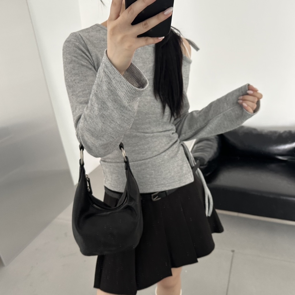 Korea 斜肩綁帶腰身針織坑紋針織上衣
