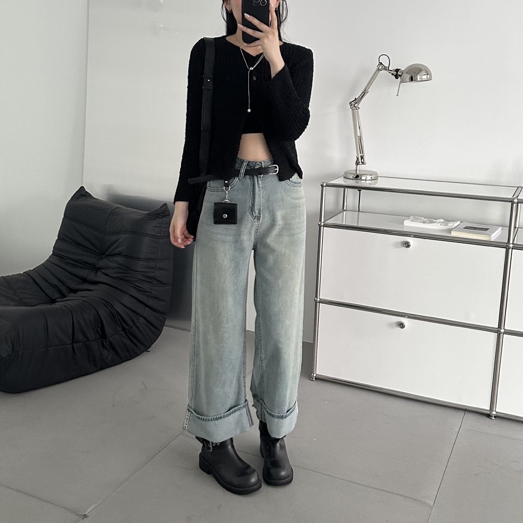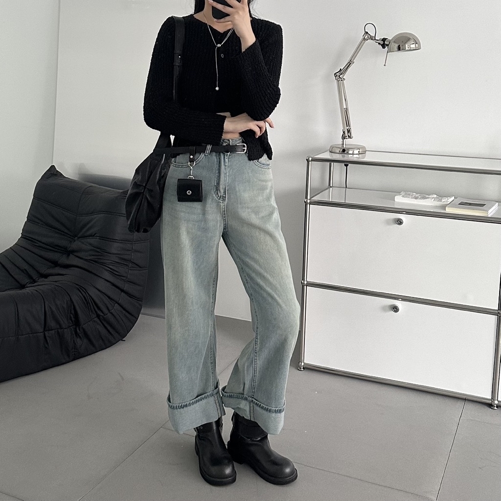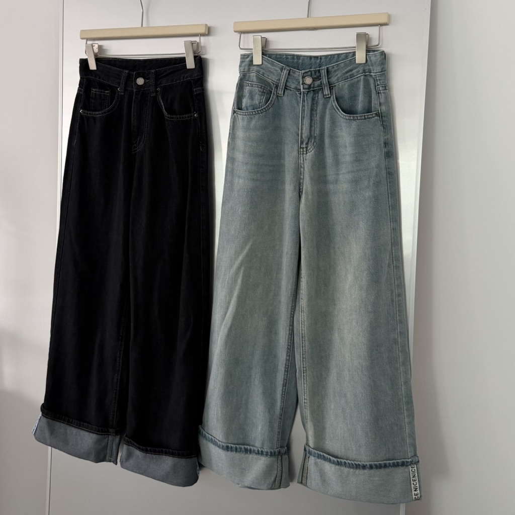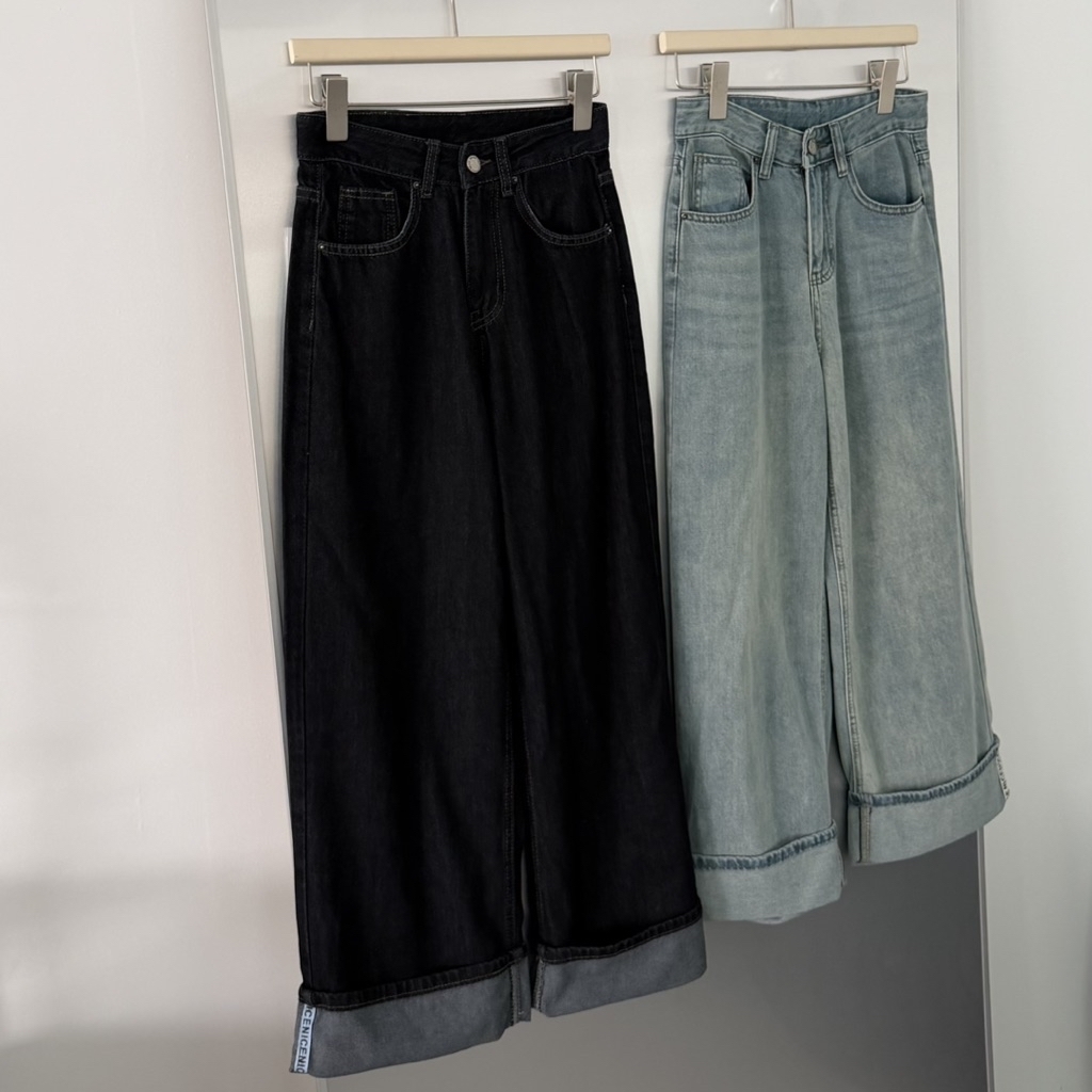 小布標丹寧反摺微寬剪裁直筒褲