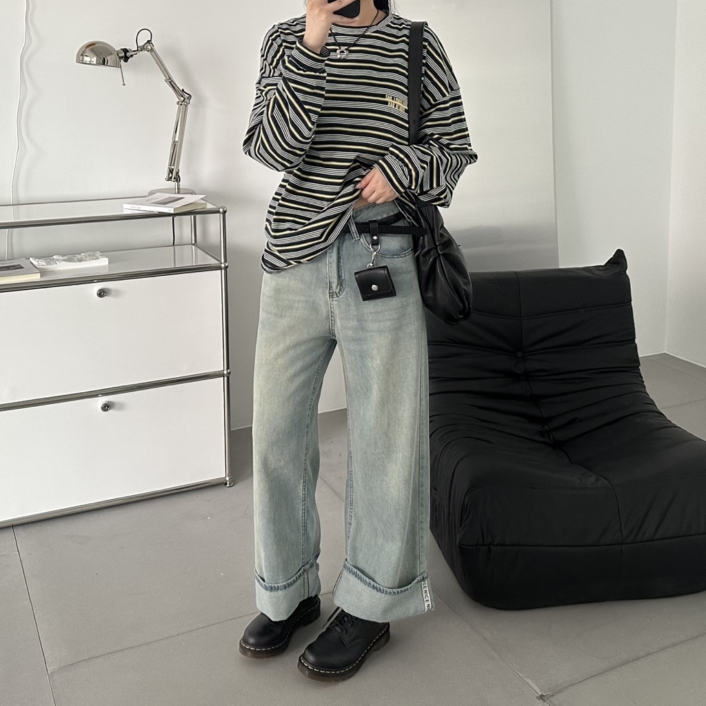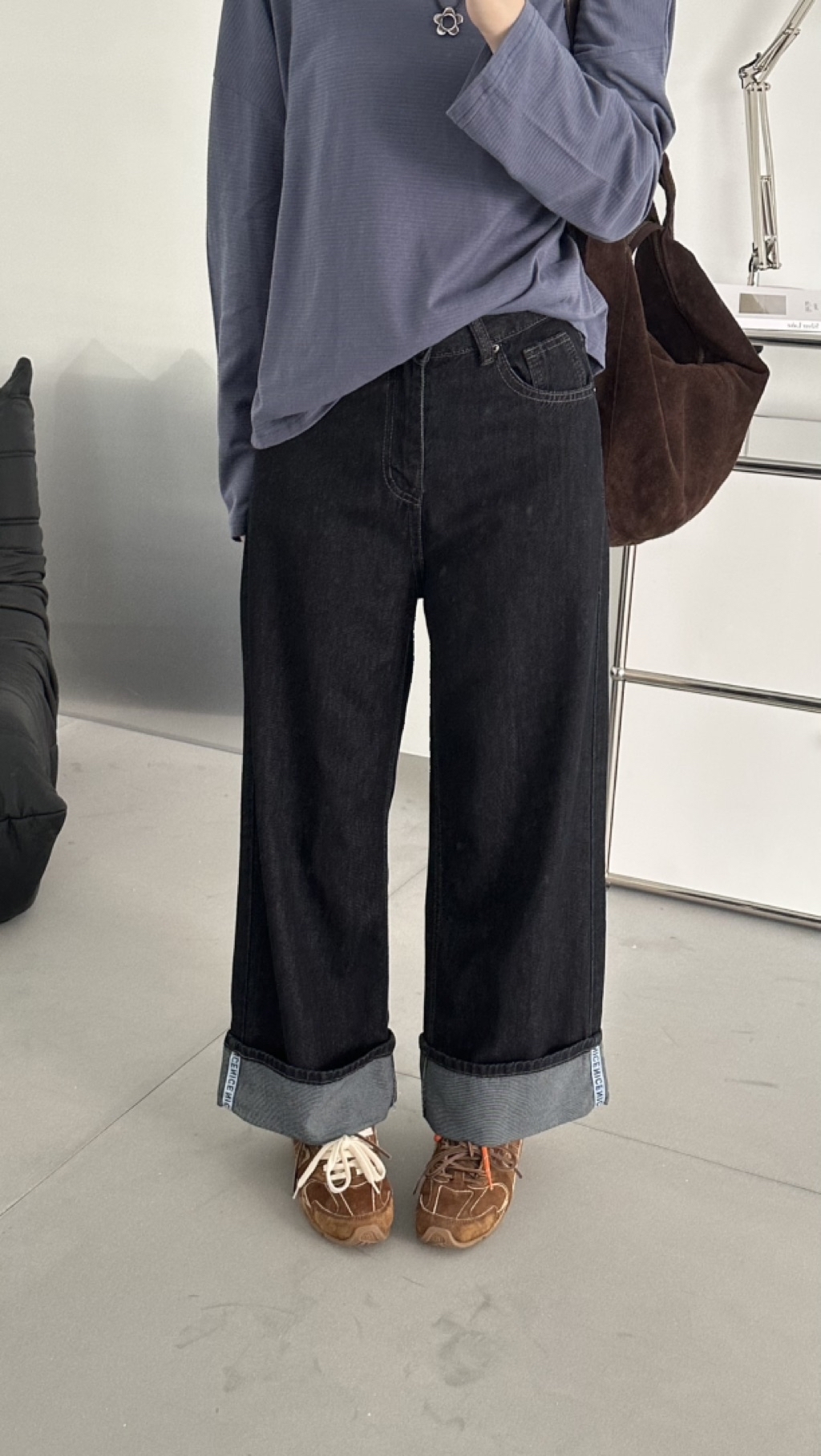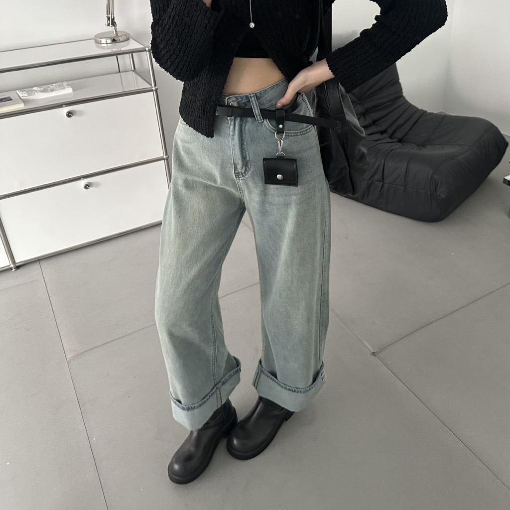 小布標丹寧反摺微寬剪裁直筒褲